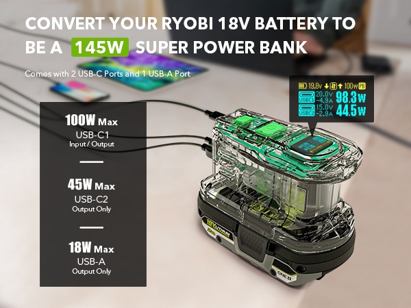 $68:87 (SYMIK 100W Charger & 145W Power Source for Ryobi 18V Batteries, Advanced Two-Way Charger & Portable Power Station) w/OLED Screen for Ryobi 18 Volt Lithium-Ion, 2 USB-C & 1 USB-A Port, LED Task Light.